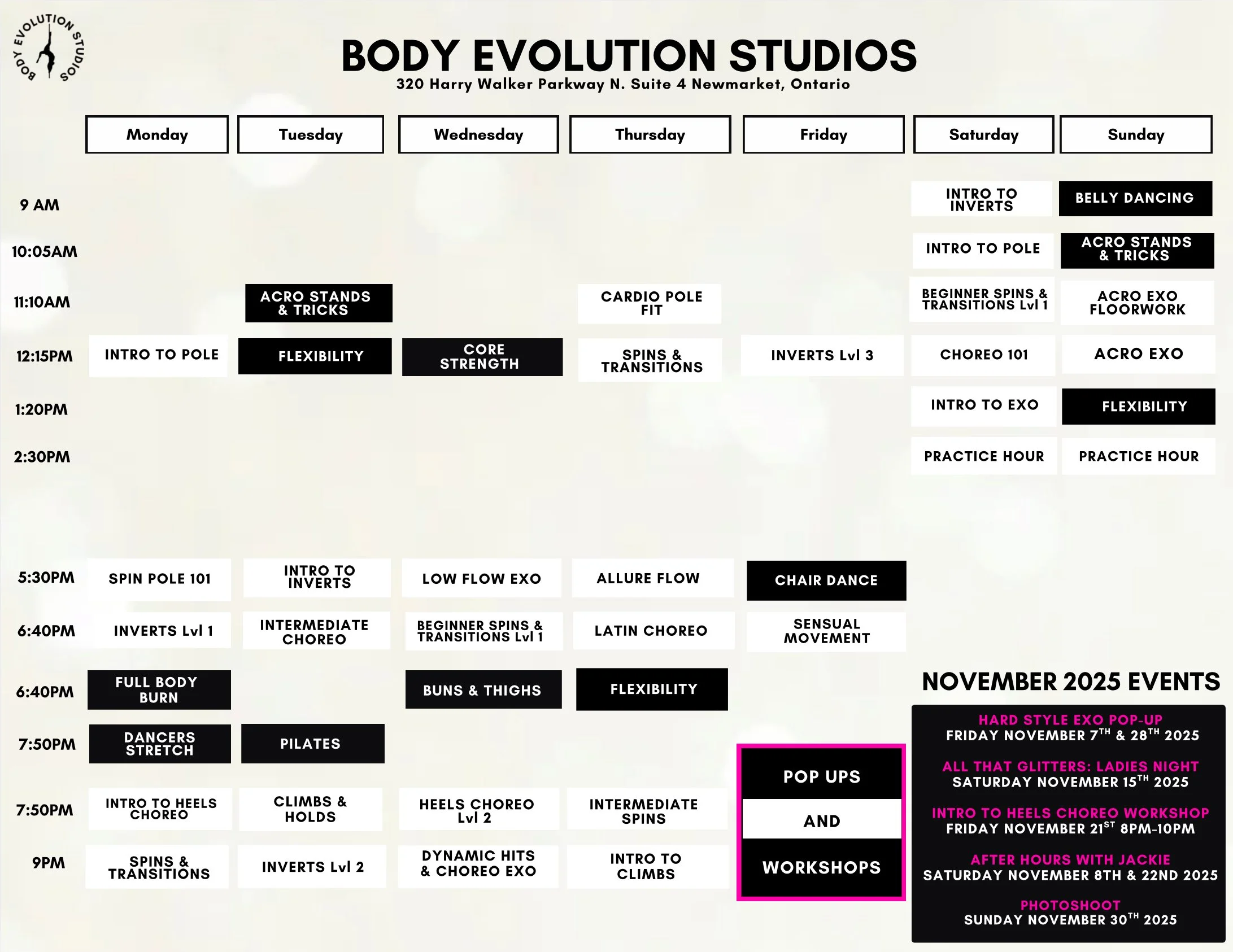 Body Evolution Studios is a Pole and Fitness Studio located in Newmarket, Ontario. Specializing in private and group pole lessons, an extensive range of group yoga and fitness classes, regular workshops and seminars for dance, fitness and health enthusiasts.